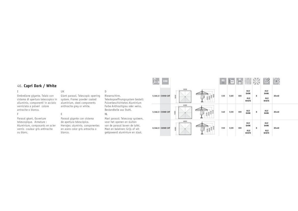 Model CAPRI STARWHITE s aluminijskom konstrukcijom u bijeloj boji premazanom epoksidom, što suncobran čini elegantnim. Čvrstoća materijala i komponenata, te teleskopski sustav otvaranja omogućuju jednostavno i profesionalno upravljanje,