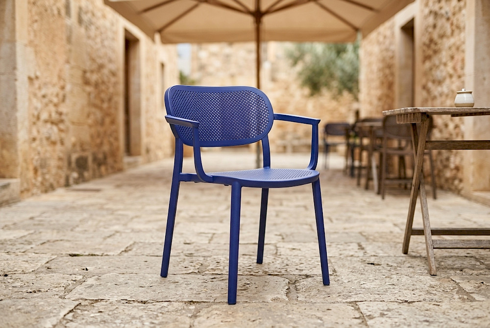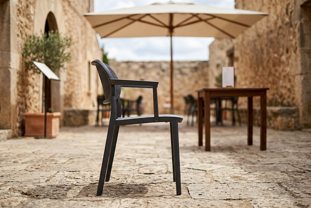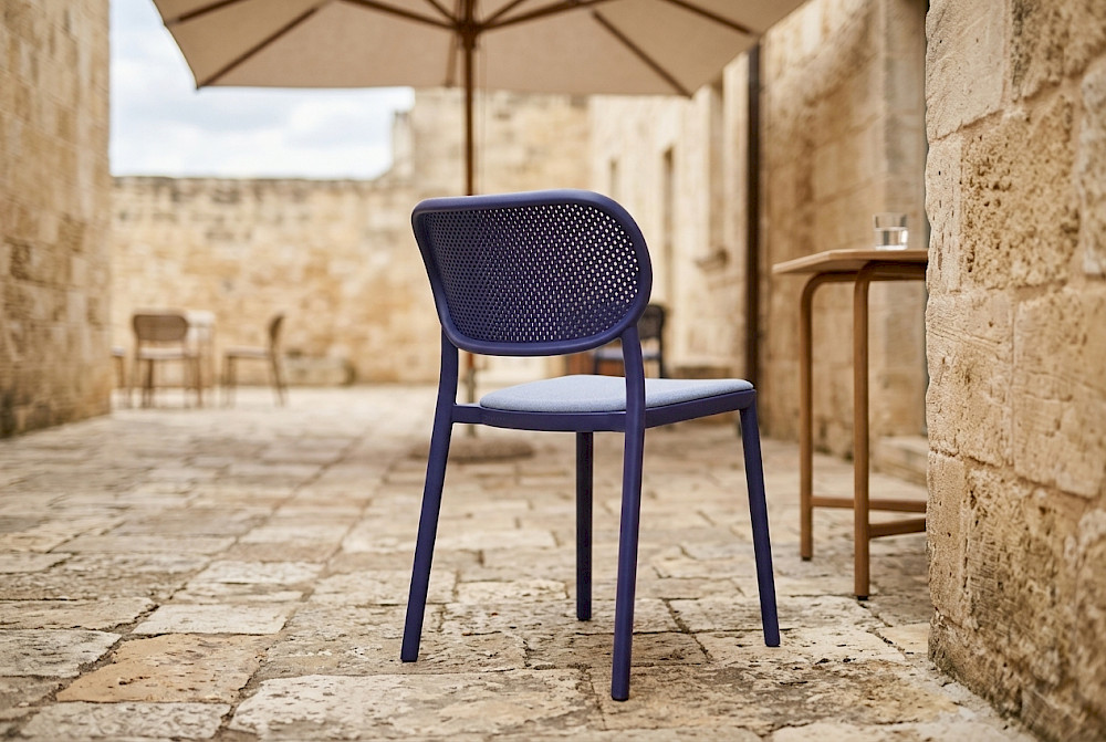 Nuta kolekcija stolica izrađena je za unutarnje i vanjske prostore, s naglaskom na udobnost i estetsku ravnotežu. Dostupna je i u tapeciranoj verziji sjedala i naslona. Prikladna za vanjsku upotrebu. Kombinacija materijala i završnih obrada omogućuje prilagodbu različitim stilovima.
